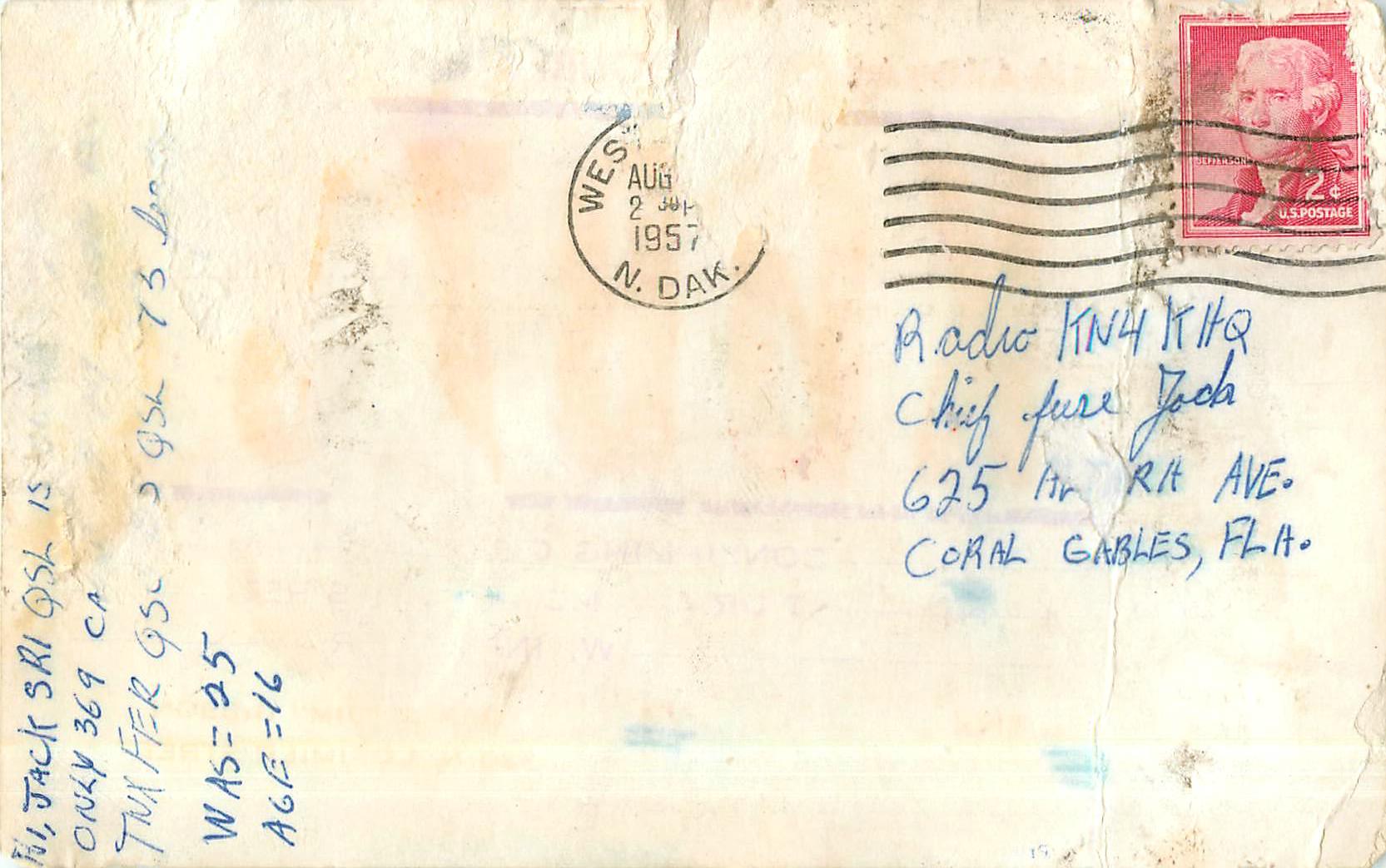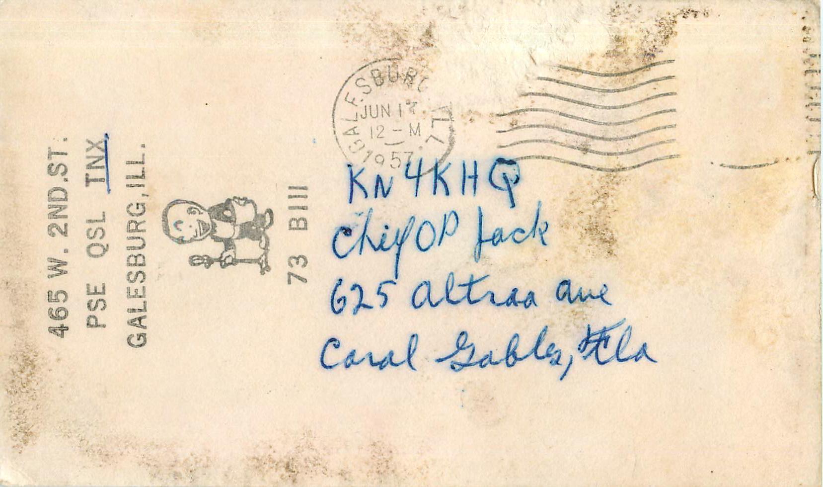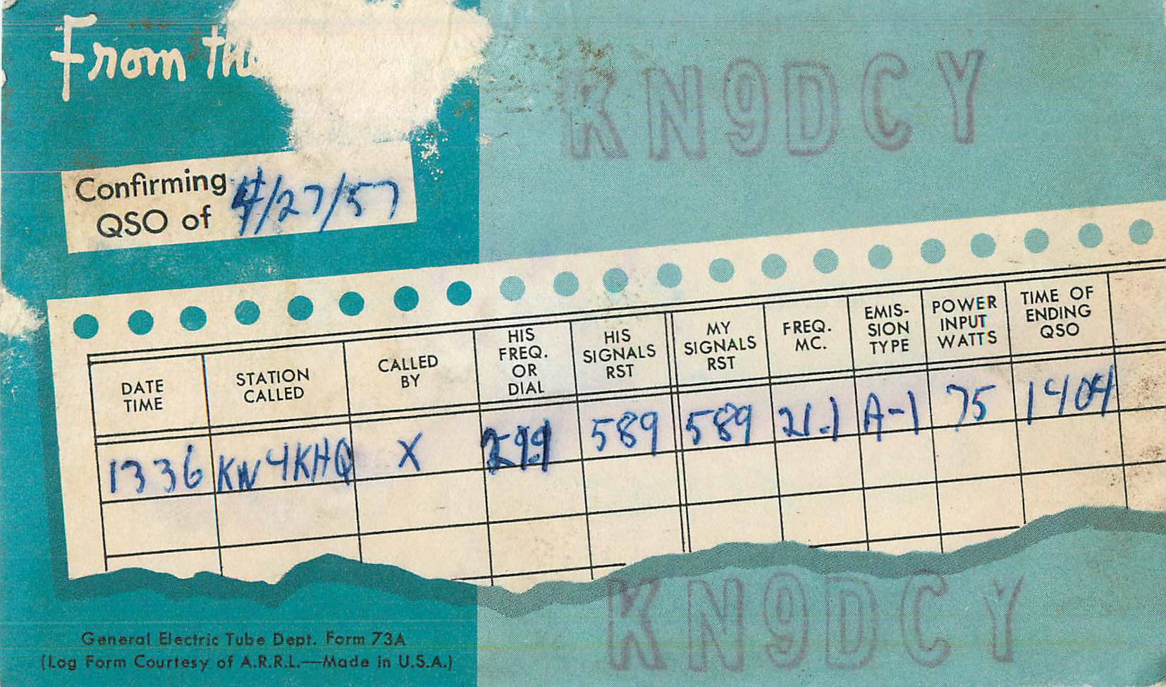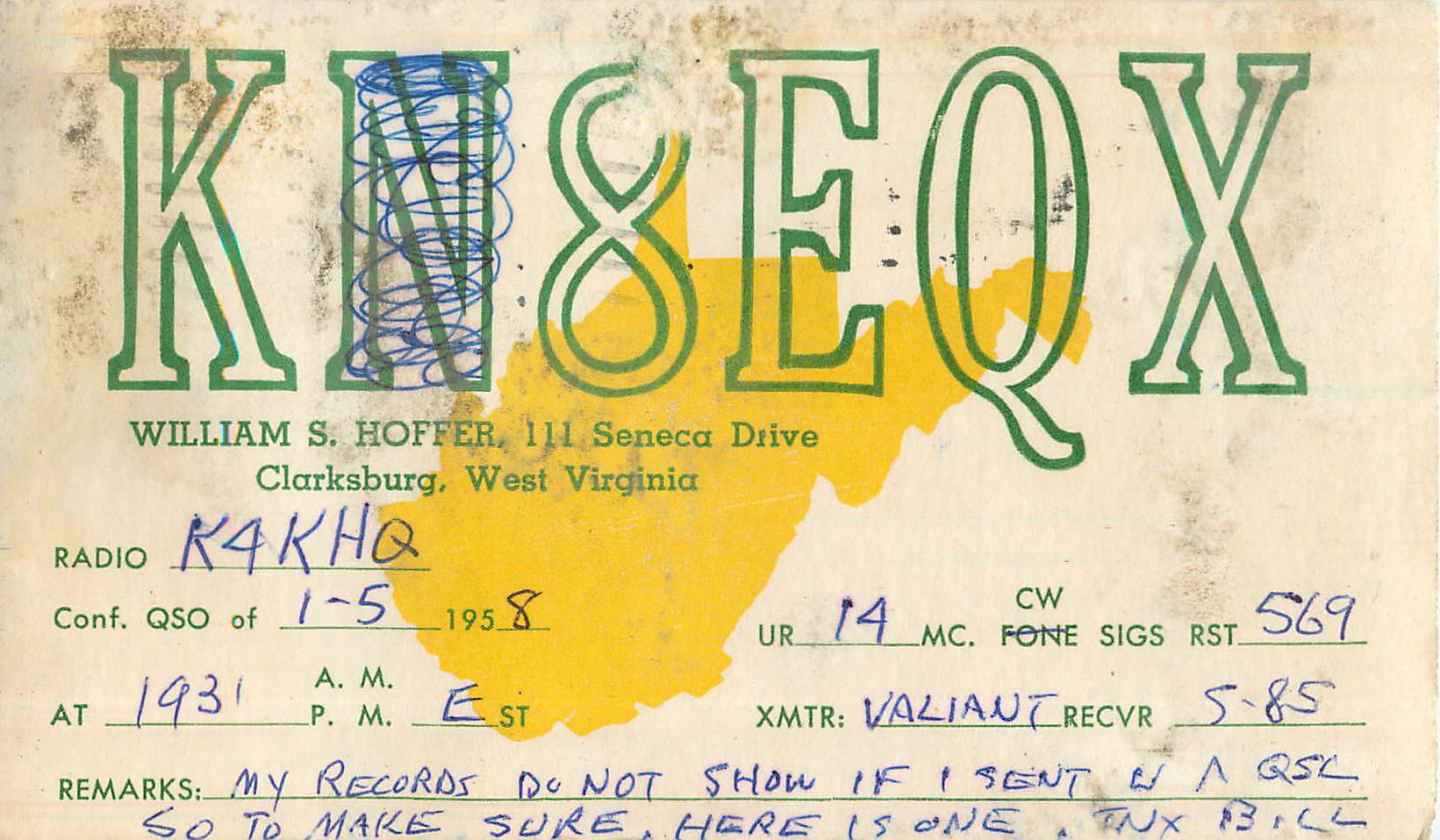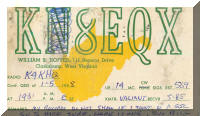 Since all novice licensees had a "N" as a second letter in their call and the license was only issued for two years. When upgrading to a higher license the FCC reissued the call and dropped the "N". This QSL card on the right is typical of what one did after upgrade, crossing out the "N" on the QSL card! |